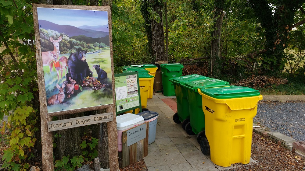 The Arts Council of the Valley provided funding through an Advancing the Arts grant for Erin Murray to create the artwork that is featured at the Compost Drop-off bins’ site. In August 2019, the work was dedicated “to all composting efforts in Harrisonburg,” with a celebration of composting during a Saturday Farmers Market. The original work, acrylic on wood, will be rotating around public venues, while the print on aluminum stays permanently installed at the bins’ site off Warren St.